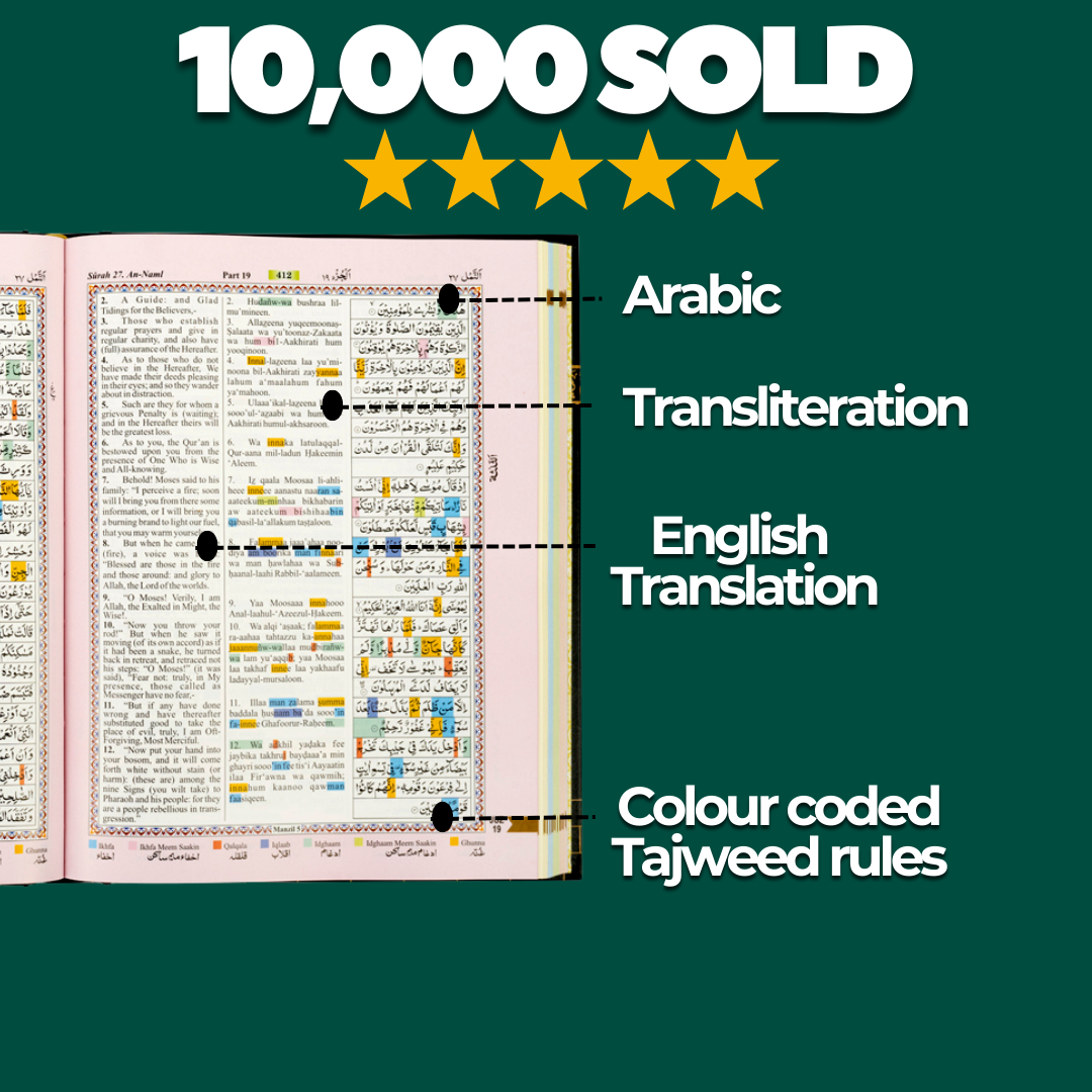 Quran is colour coded for tajweed, and has Arabic with English translation and transliteration in an easy to follow format.