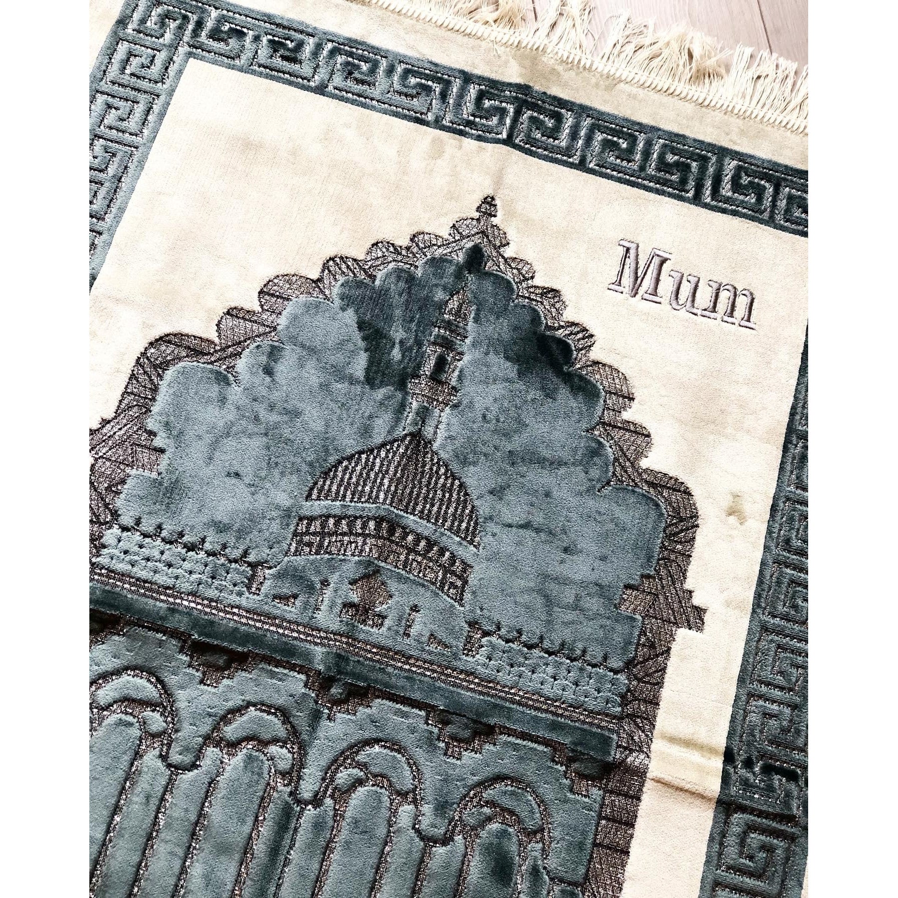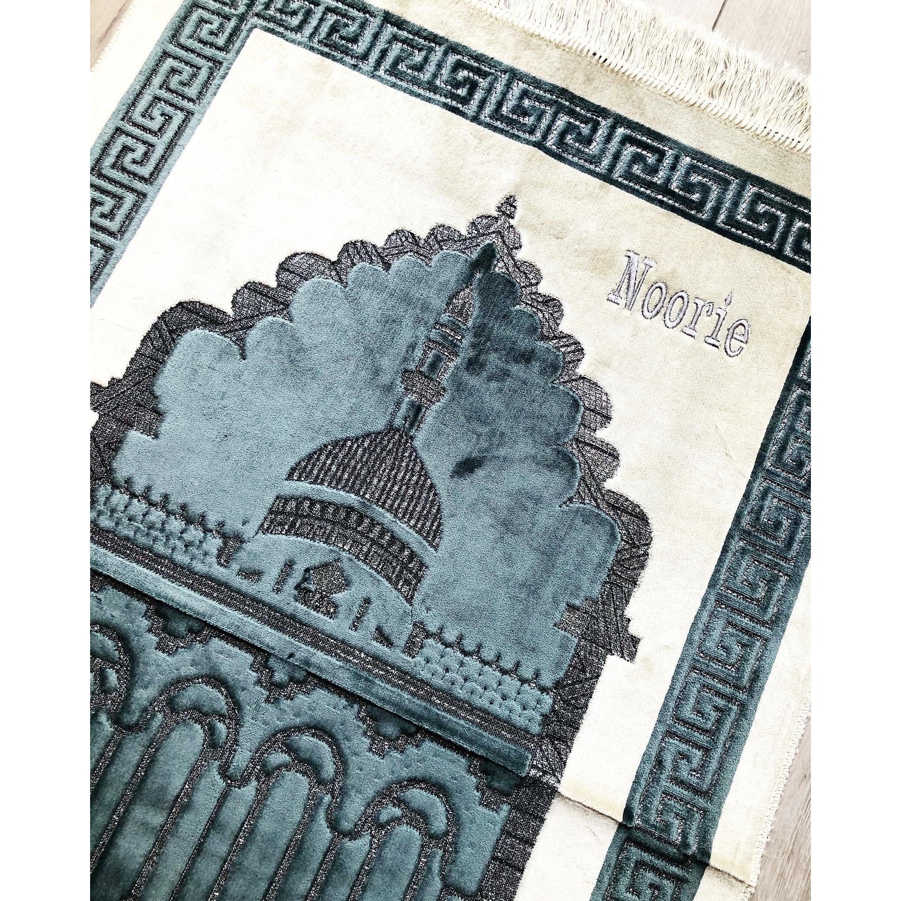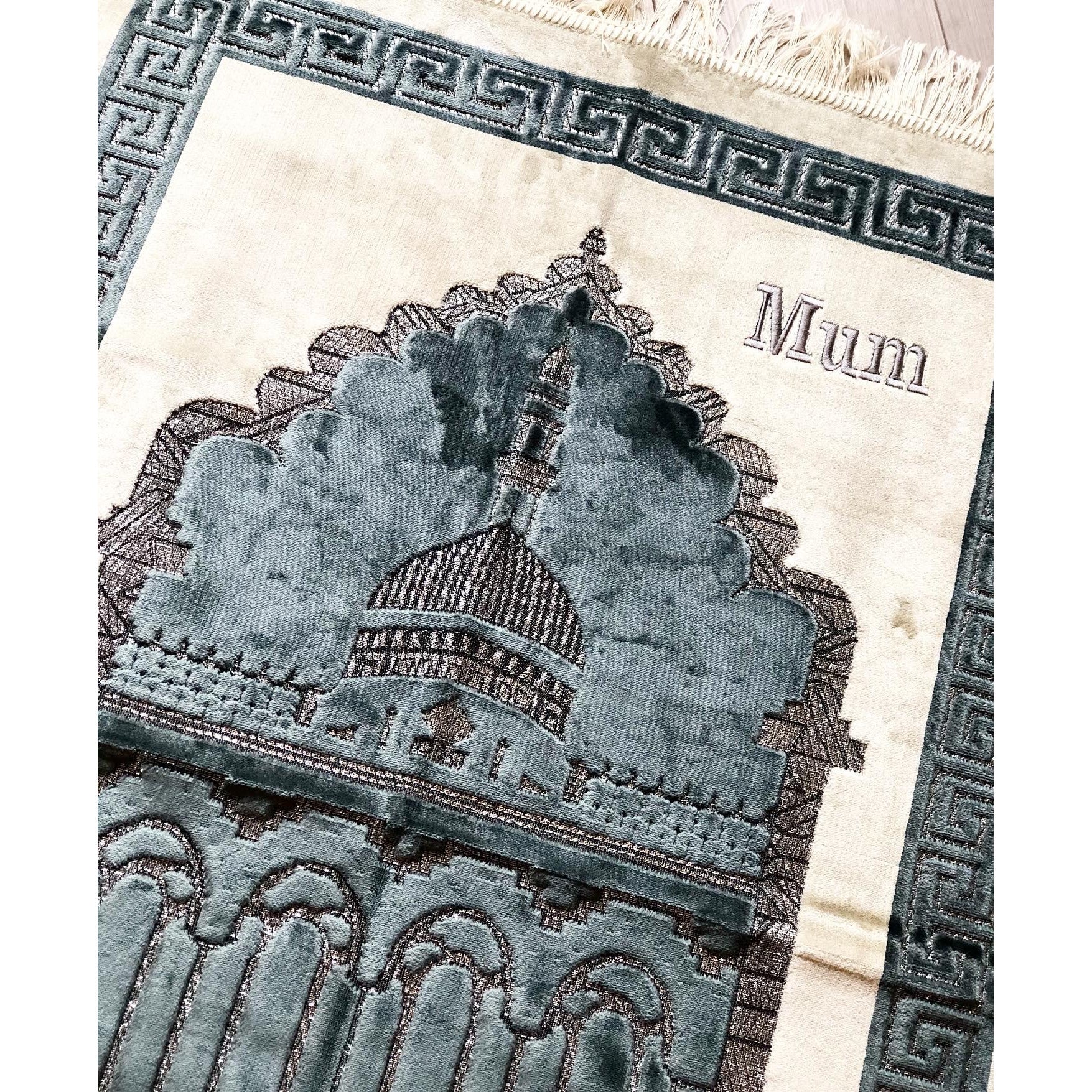 Personalised with one name in english, on the top right hand side of the prayer mat.