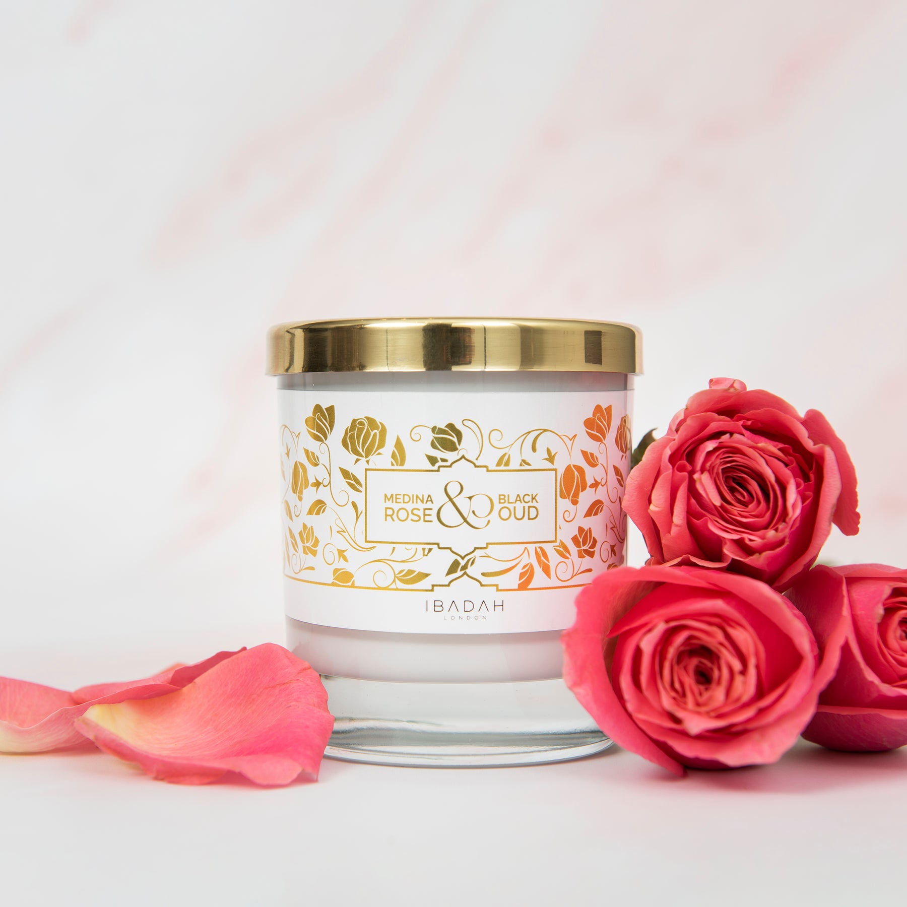 Medina Rose and Black Oud Candle - The streets of Medina encapsulated in a scent. Luxury gloss glass with gold foil design, handpoured mineral wax with an approximate burn time of 50 hours.