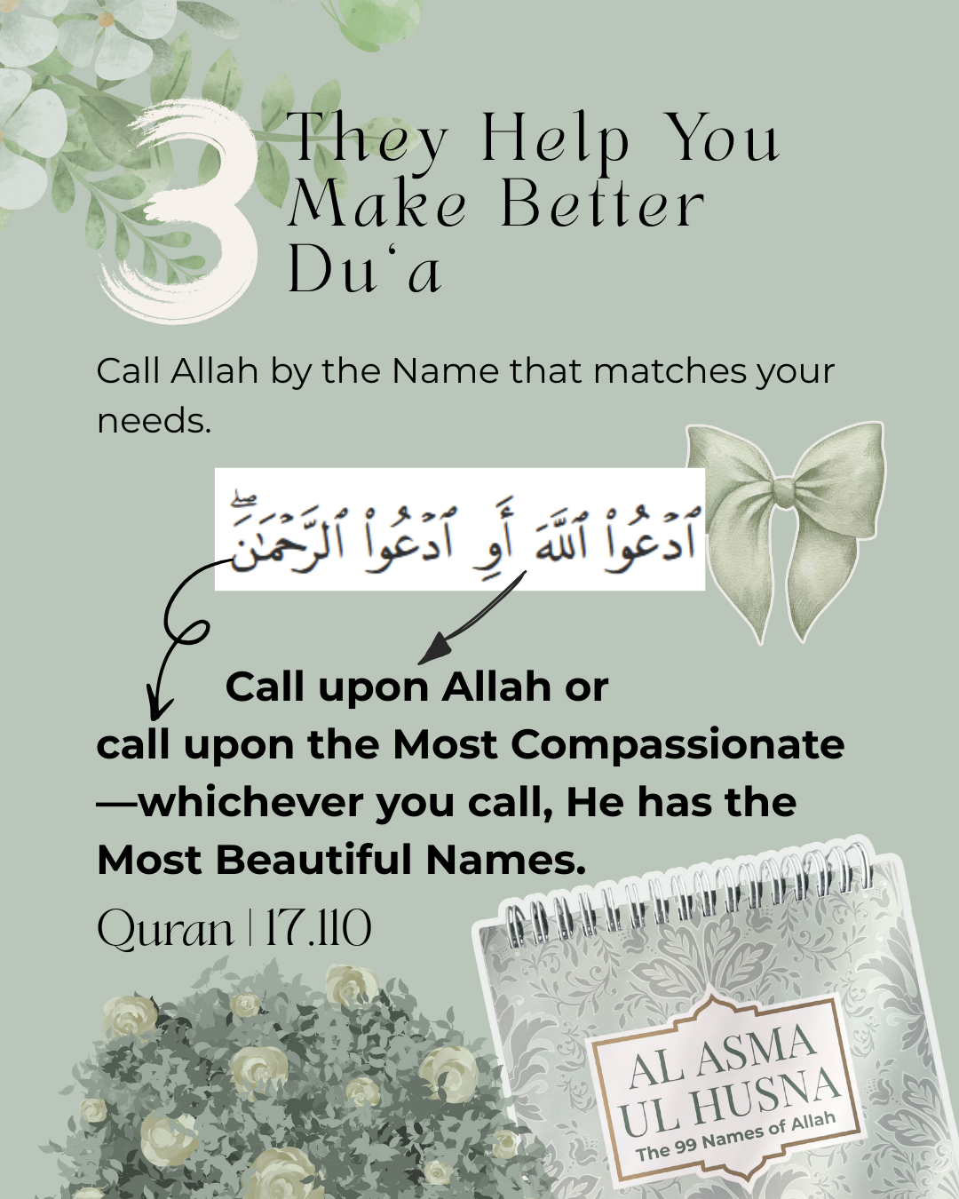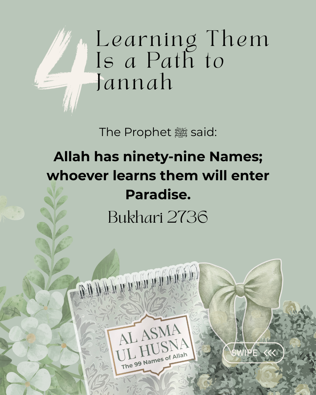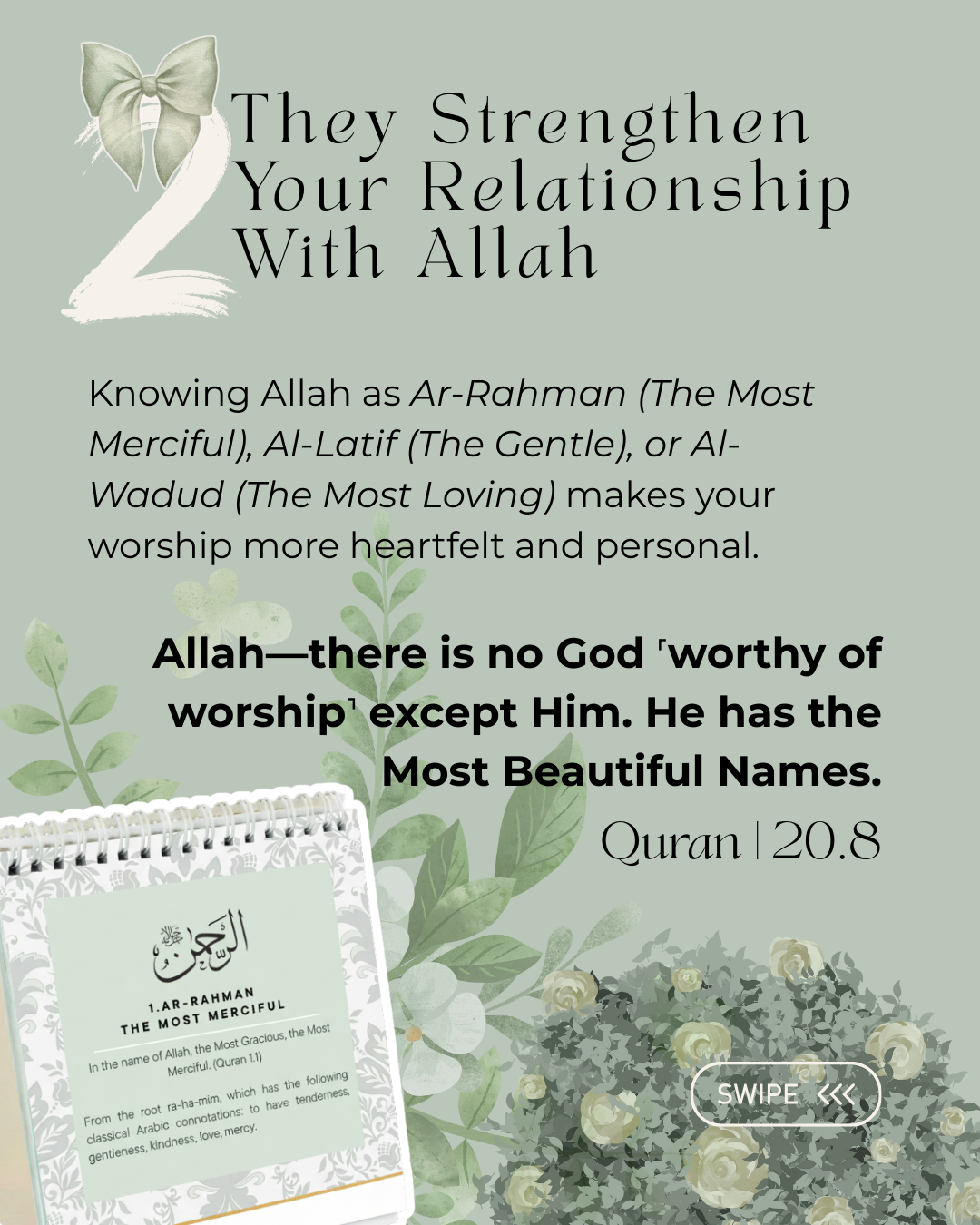 Each page unveils 2 of Allah’s beautiful Names in Arabic and English, along with their meanings and Quranic references